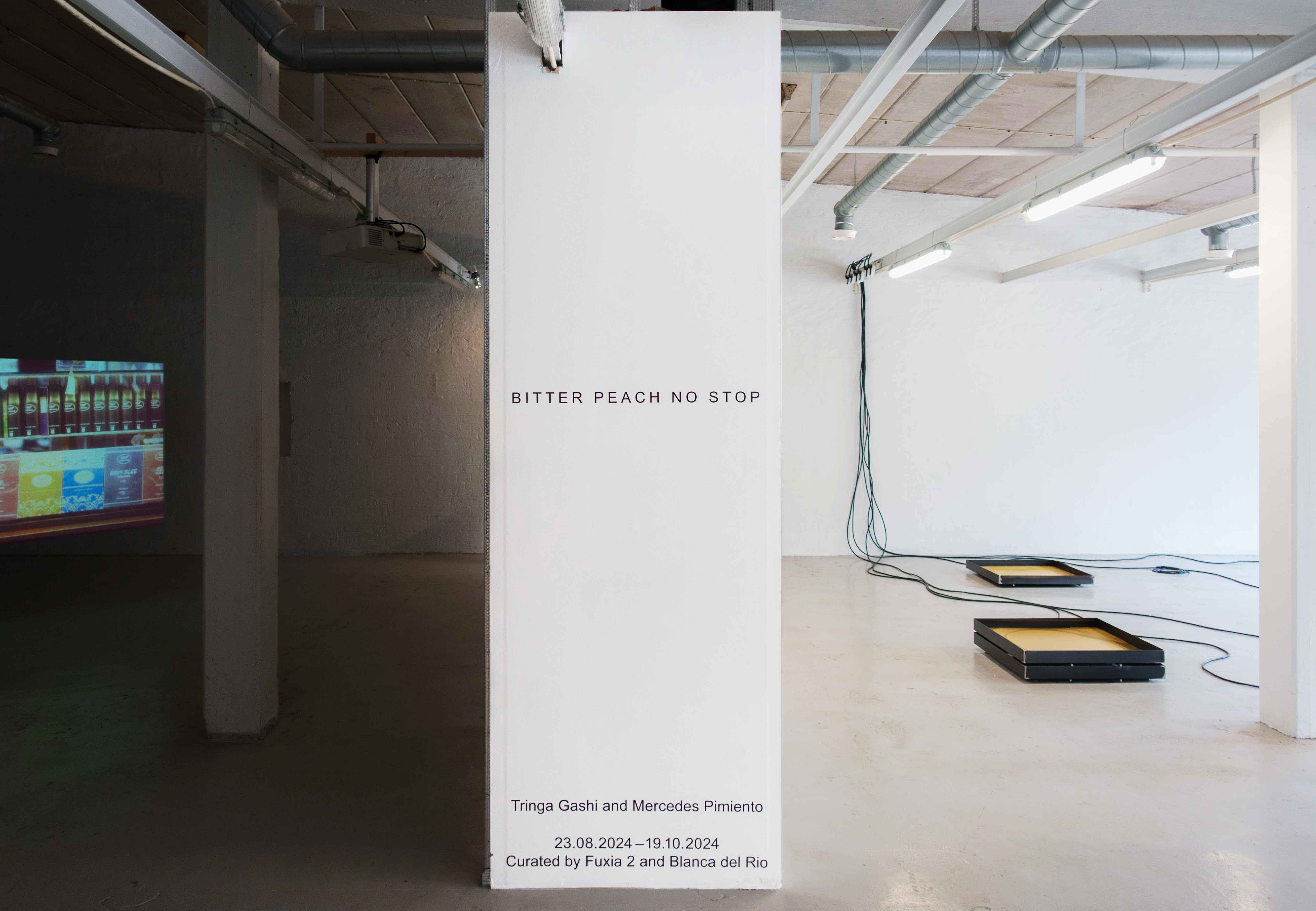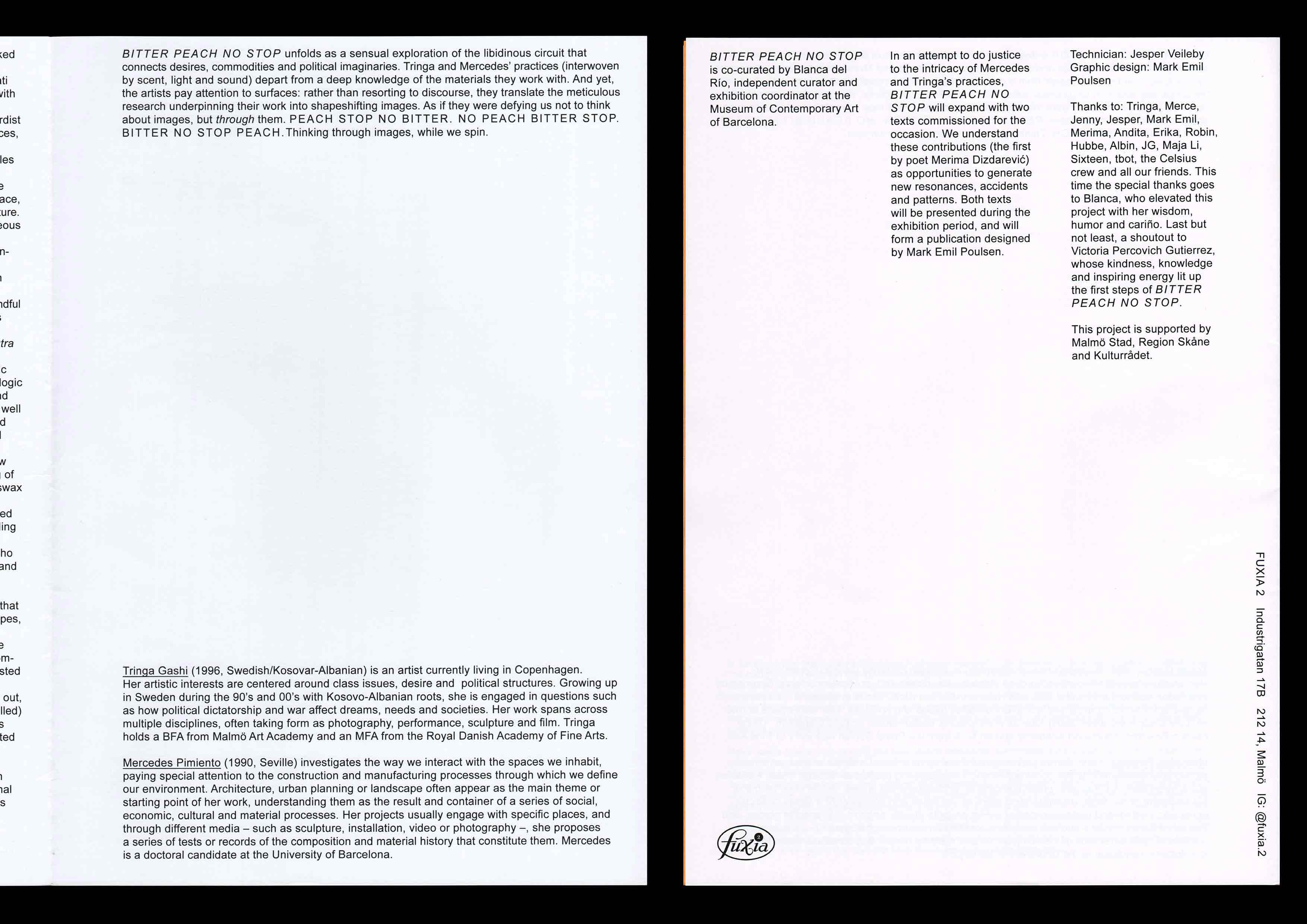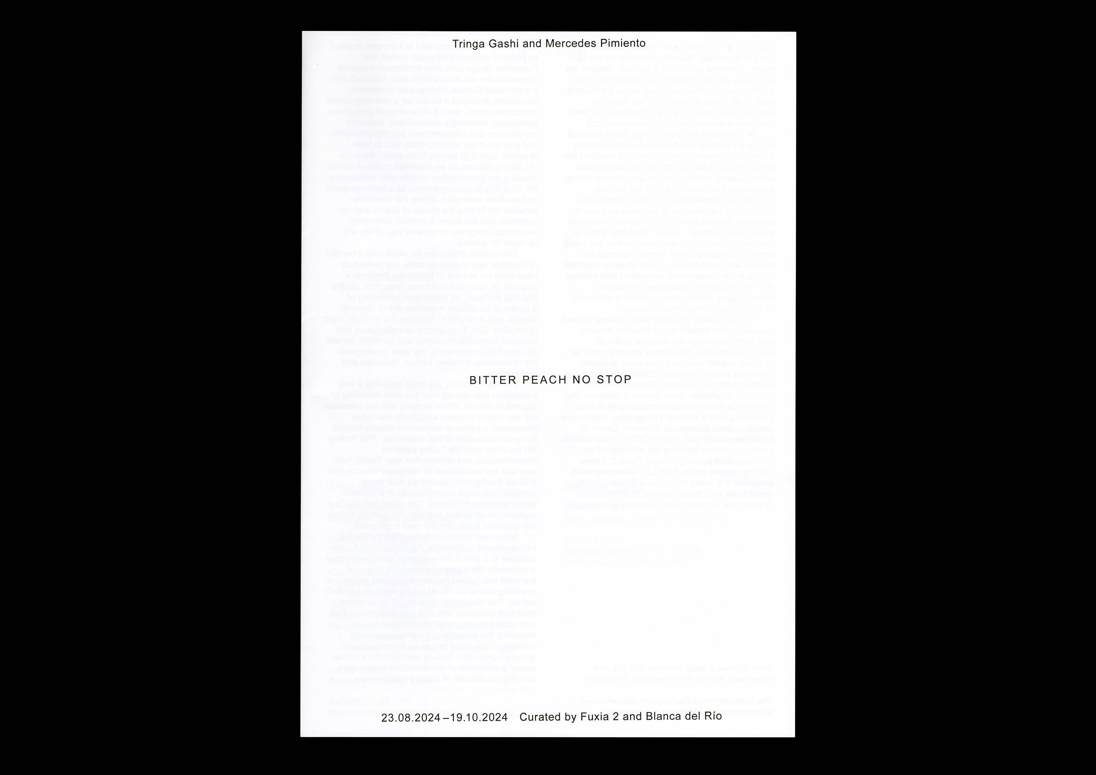 Handout and wall text for the exhibition BITTER PEACH NO STOP by Tringa Gashi and Mercedes Pimiento at Fuxia 2. The handout features textual contributions by poet Merima Dizdarević and visual artist María García Ruiz responding to the work of Tringa and Mercedes respectively. The show was curated by Fuxia 2 and Blanca del Río. 2024