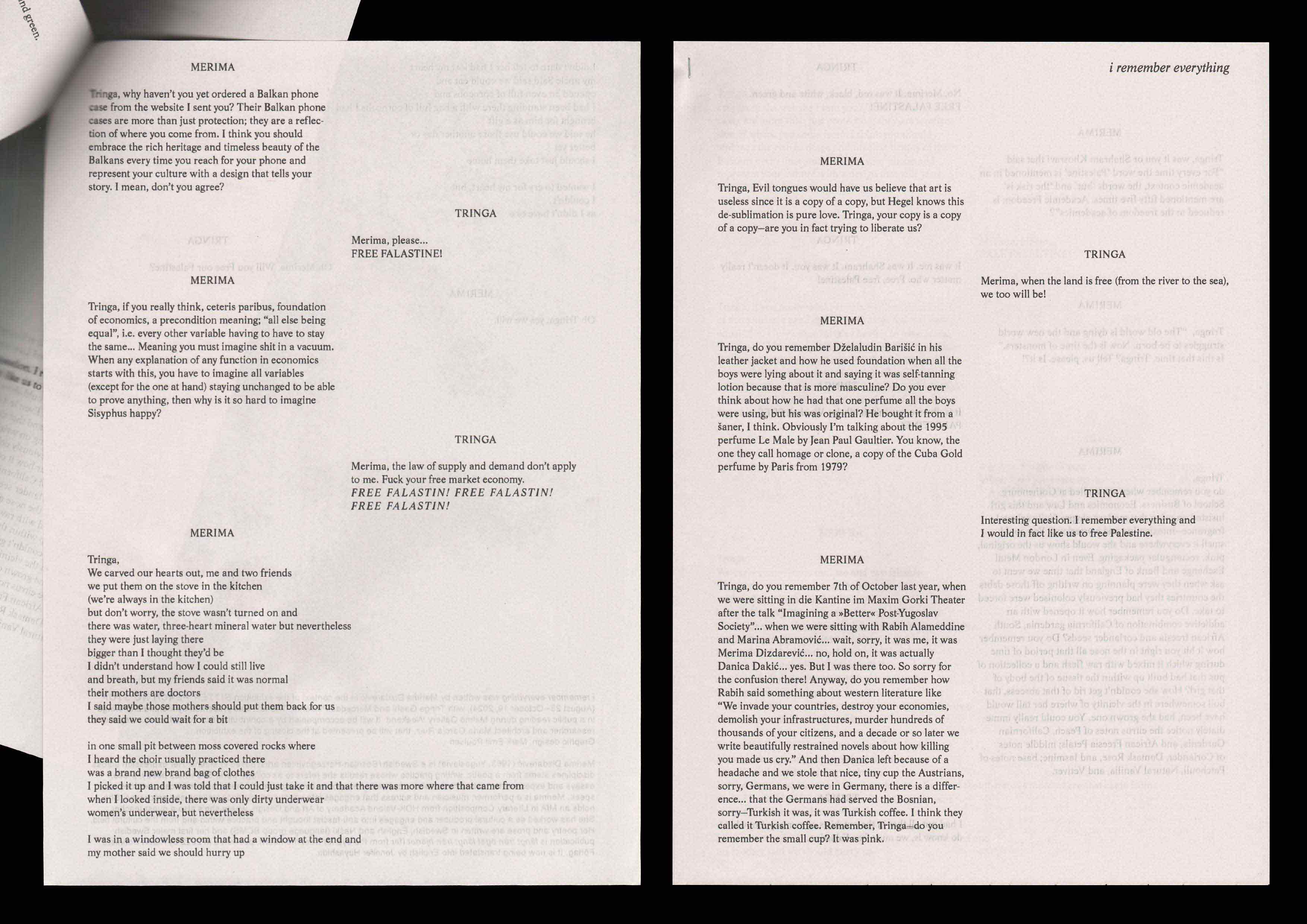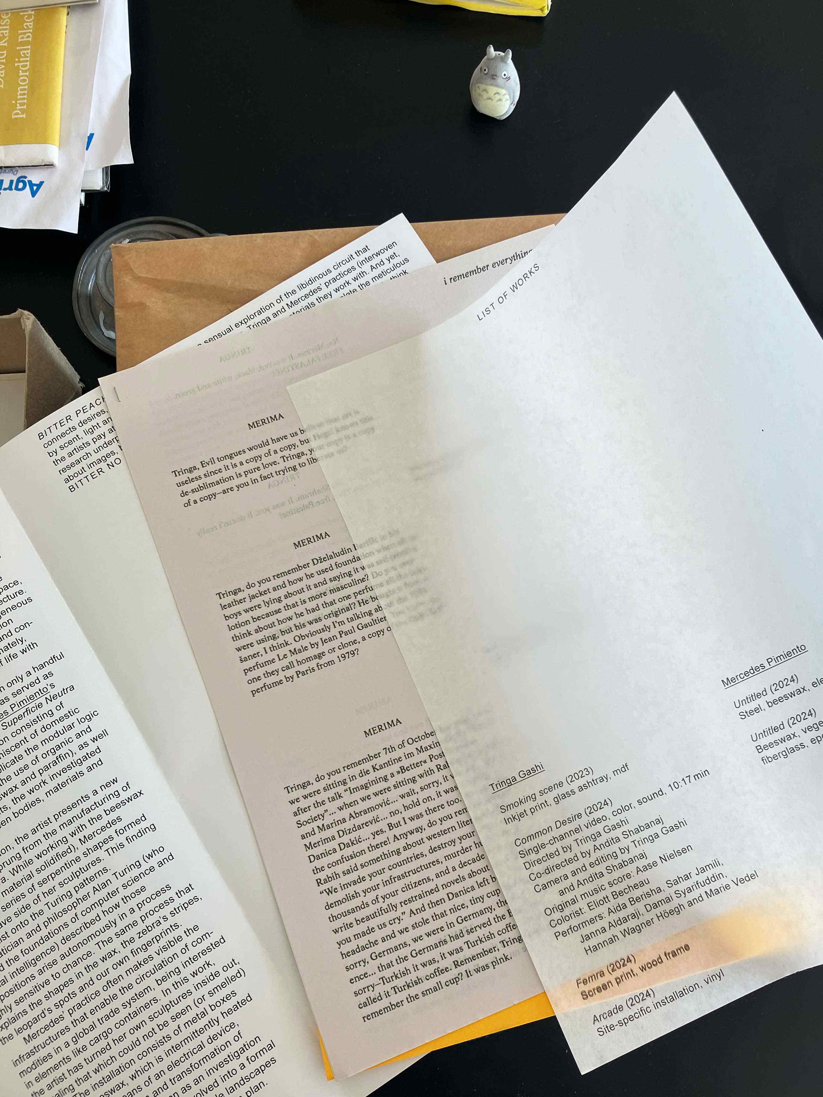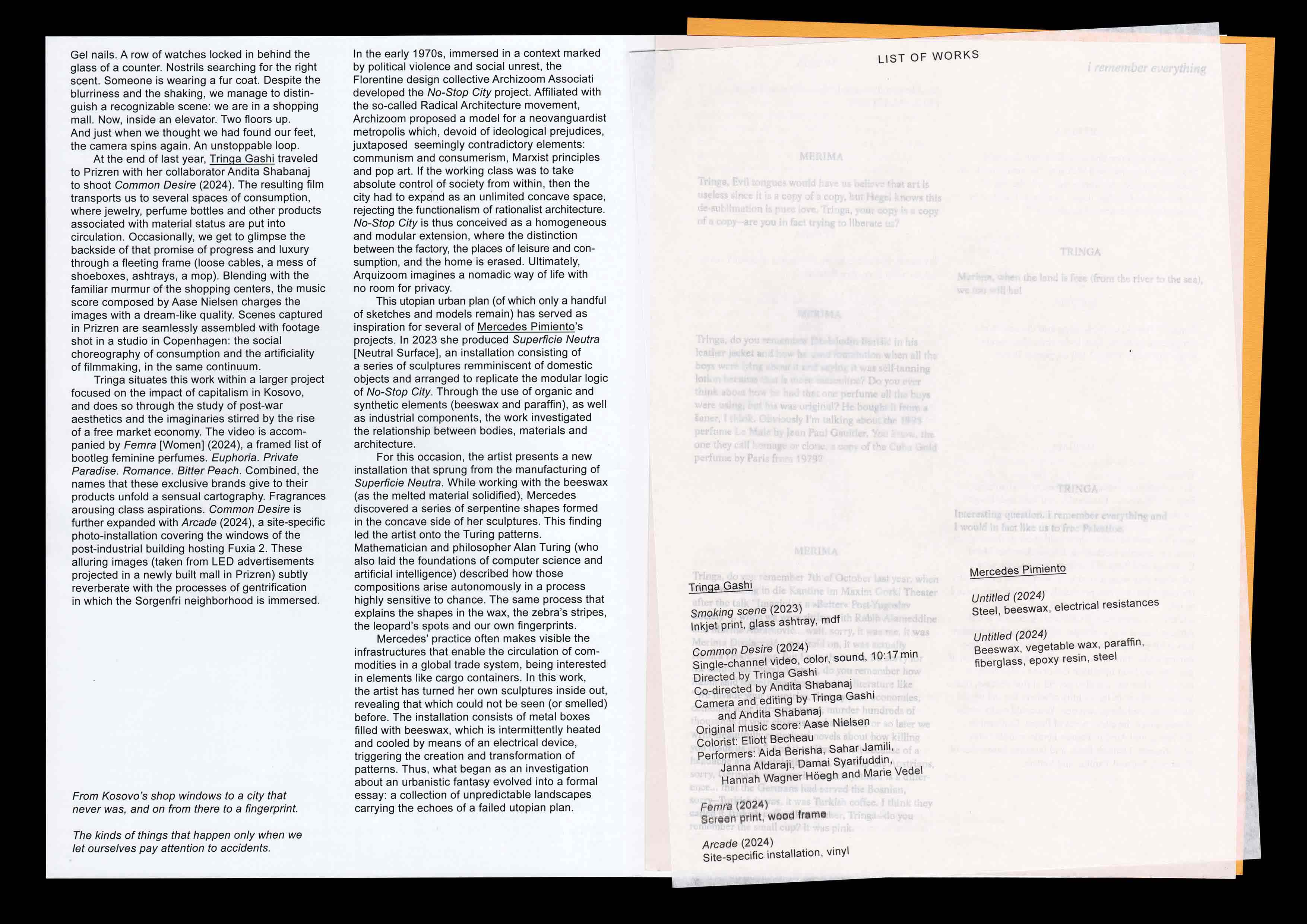 Handout and wall text for the exhibition BITTER PEACH NO STOP by Tringa Gashi and Mercedes Pimiento at Fuxia 2. The handout features textual contributions by poet Merima Dizdarević and visual artist María García Ruiz responding to the work of Tringa and Mercedes respectively. The show was curated by Fuxia 2 and Blanca del Río. 2024