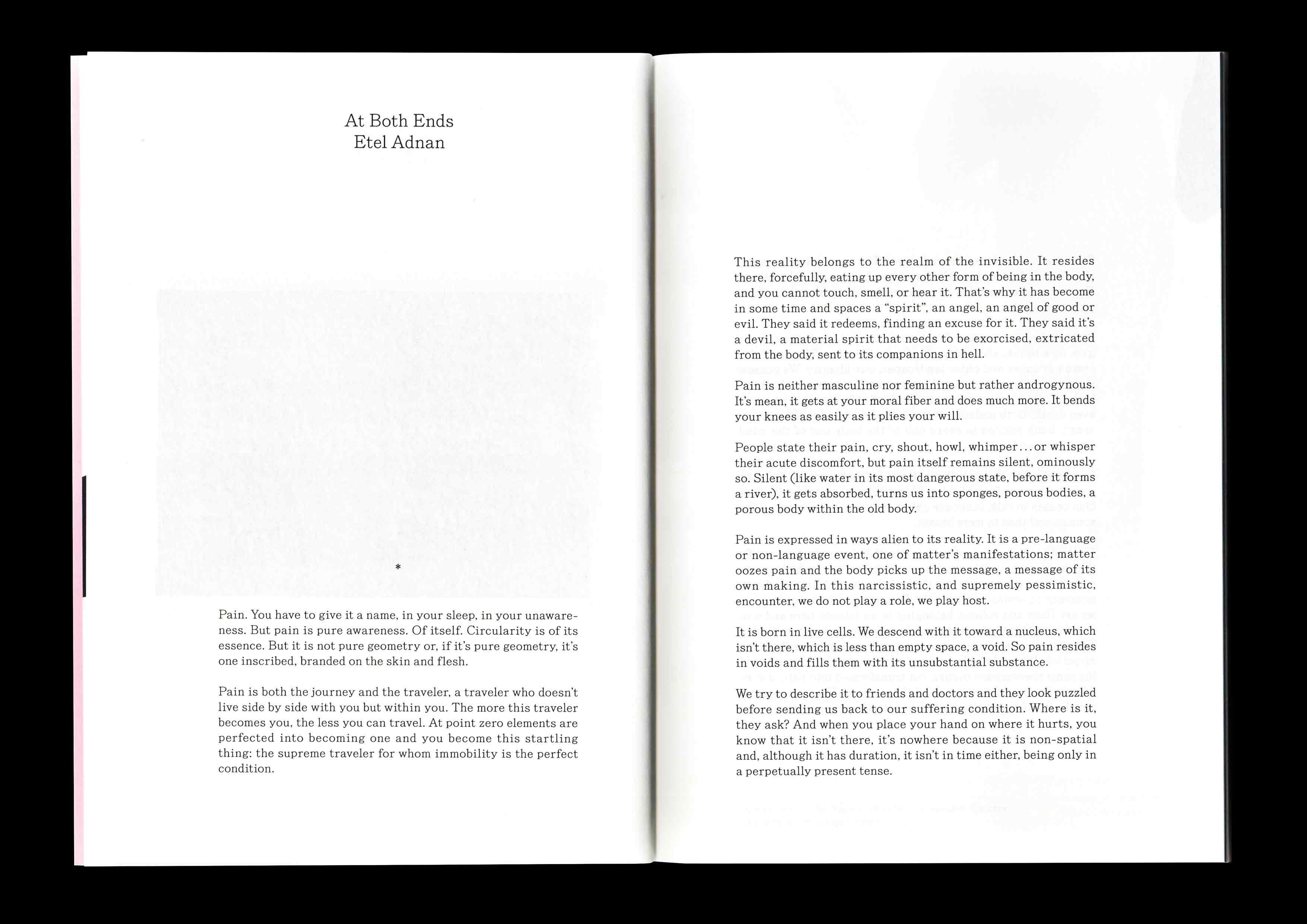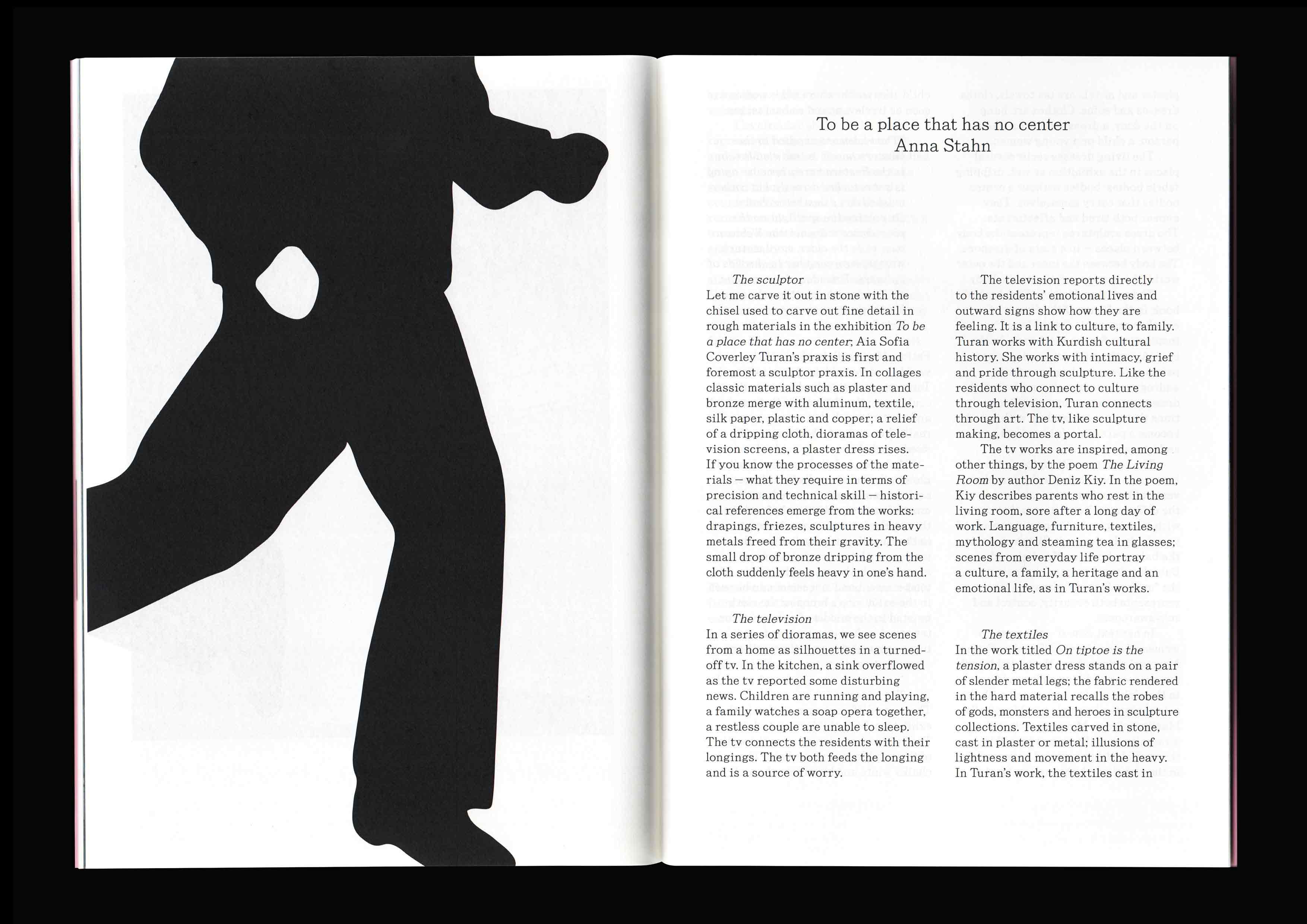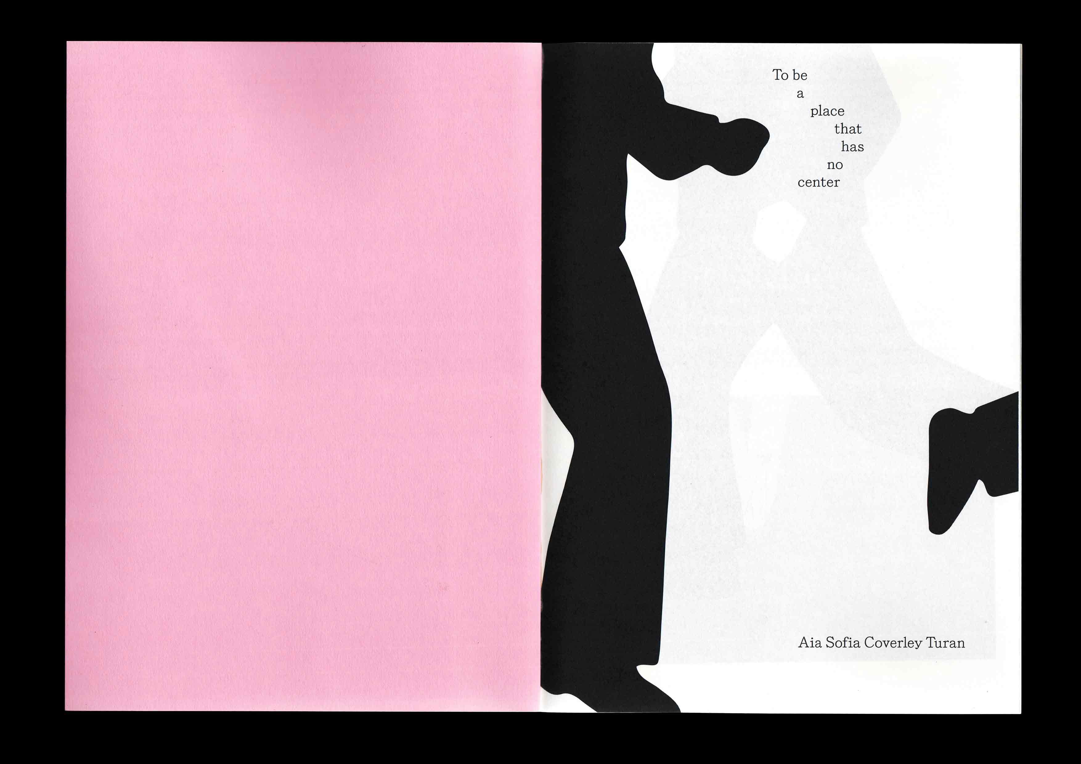 Aia Sofia Coverley Turan: Catalogue for the exhibition To be a place that has no center at HFKD – Huset For Kunst og Design. With texts by Etel Adnan, Deniz Kiy and Anna Stahn. Typeface by Phil Baber. Cover screenprinted by Benjamin Savi. Published by Huset for Kunst og Design. 2024