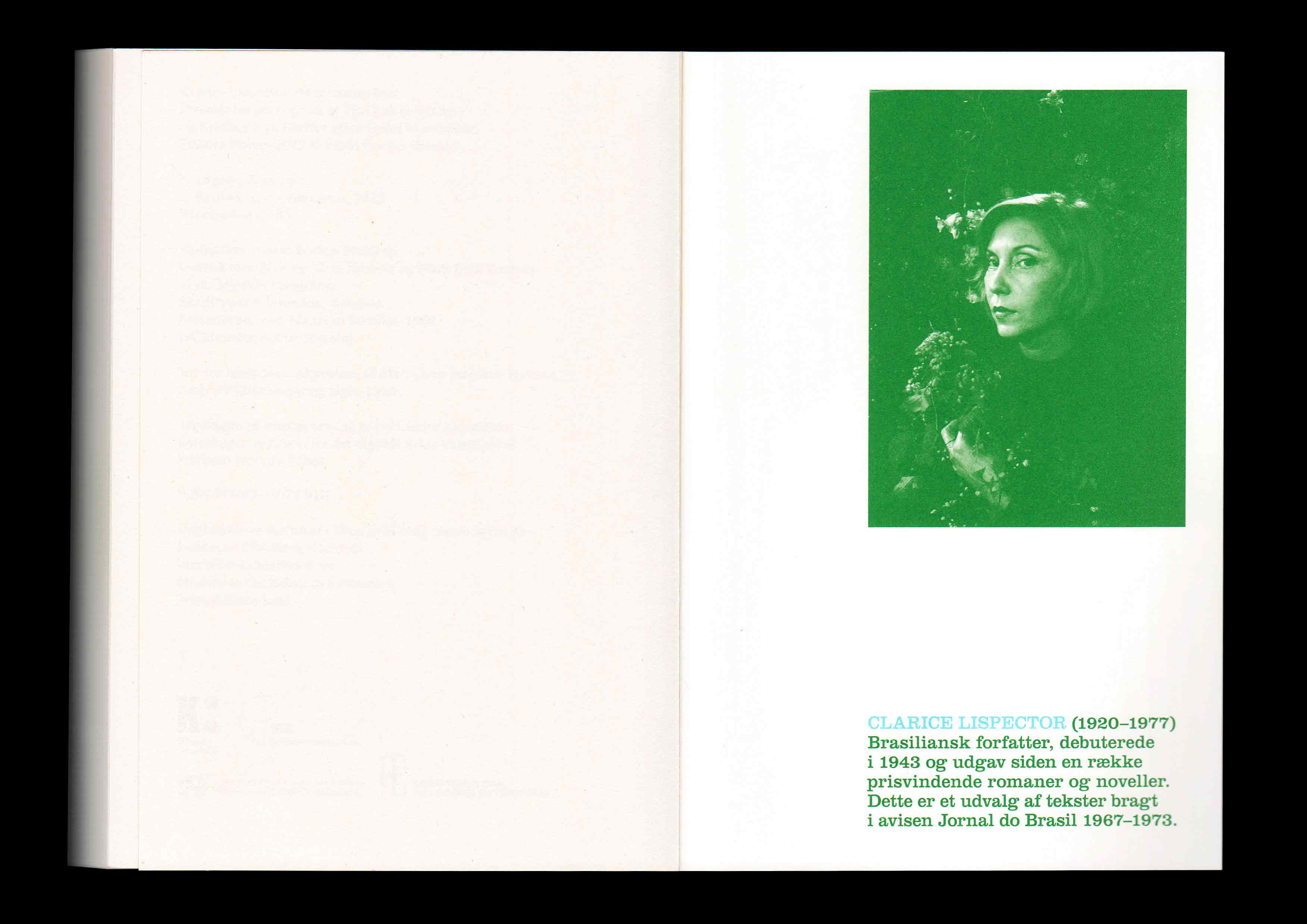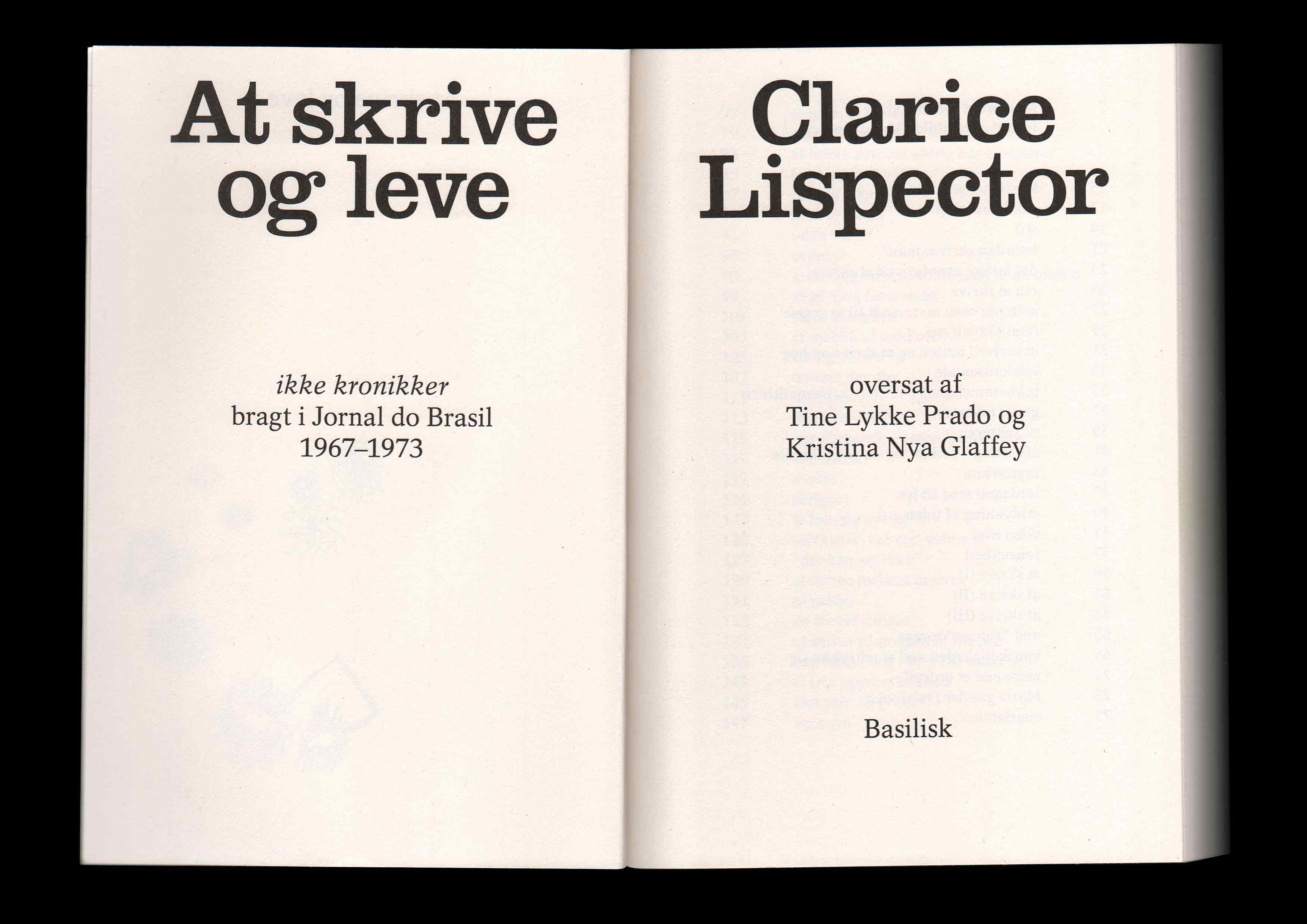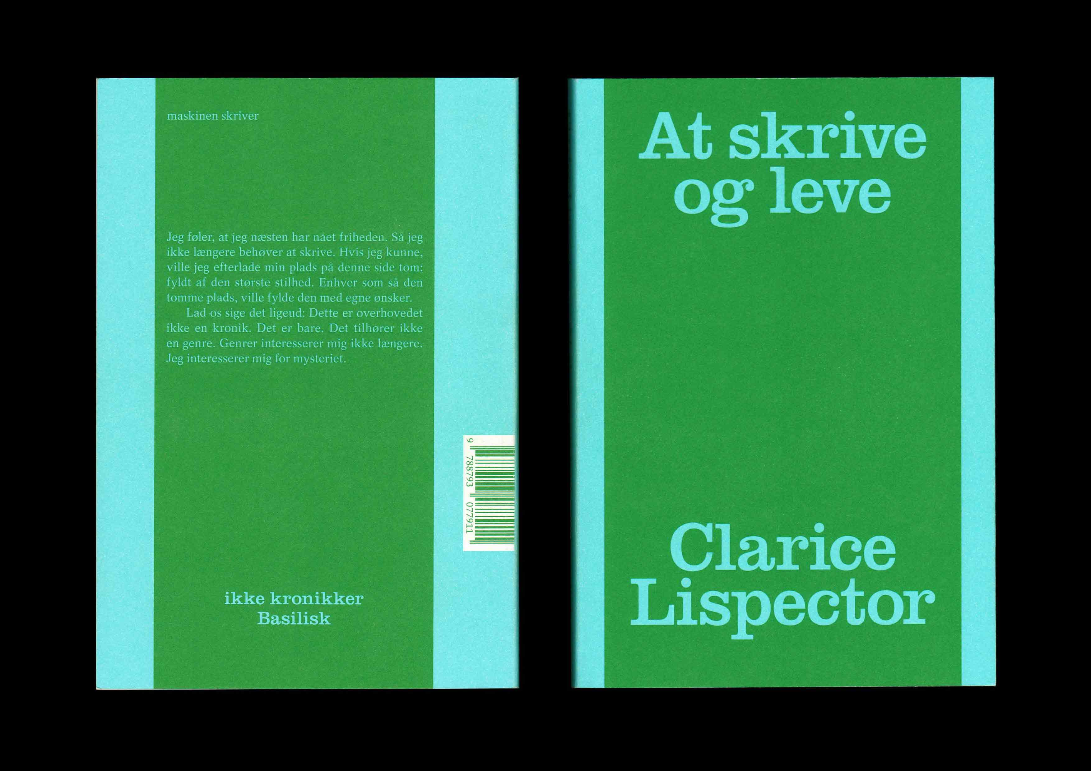 Clarice Lispector: At skrive og leve (To Write and Live). A selection of “crônicas” first published in the newspaper Jornal do Brasil between 1967–1973. Designed in collaboration with Orin Bristow. Translated by Tine Lykke Prado and Kristina Nya Glaffey. Edited by Astrid Willow Møldrup. Published by Basilisk. 2023 Selected for “Årets Bedste Bogarbejde / Best Danish Book Design 2024” by Forening for Boghaandværk (Copenhagen)