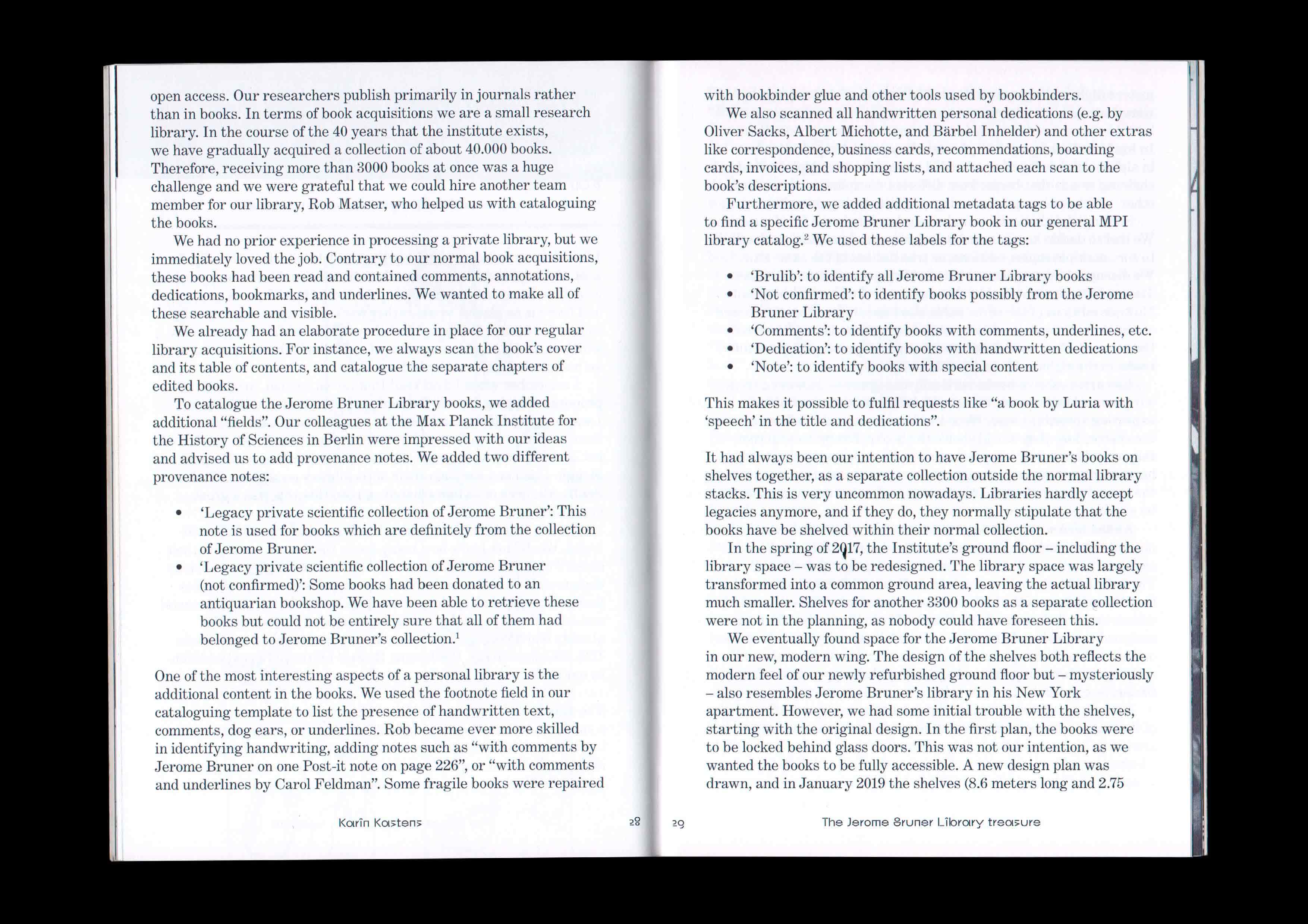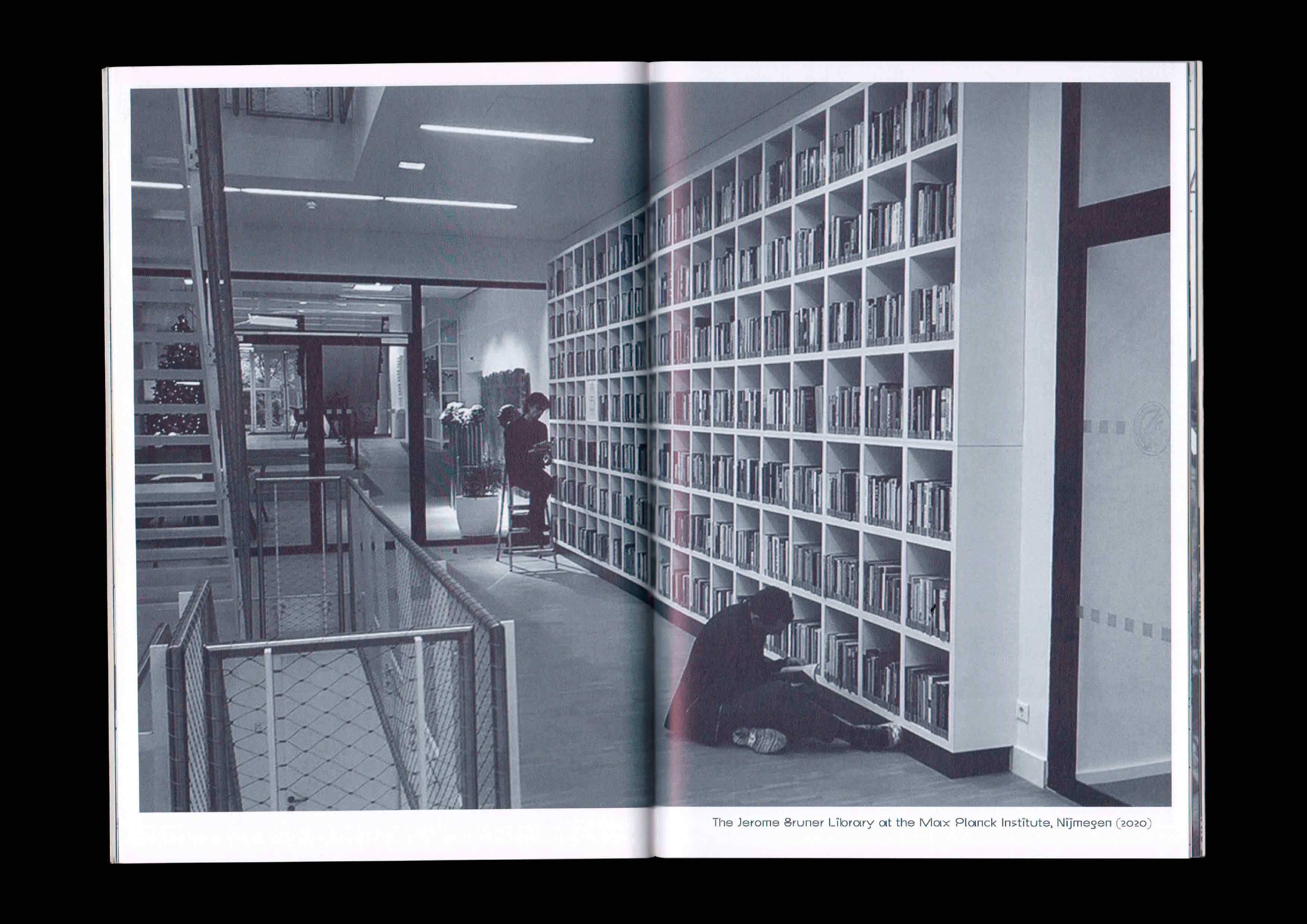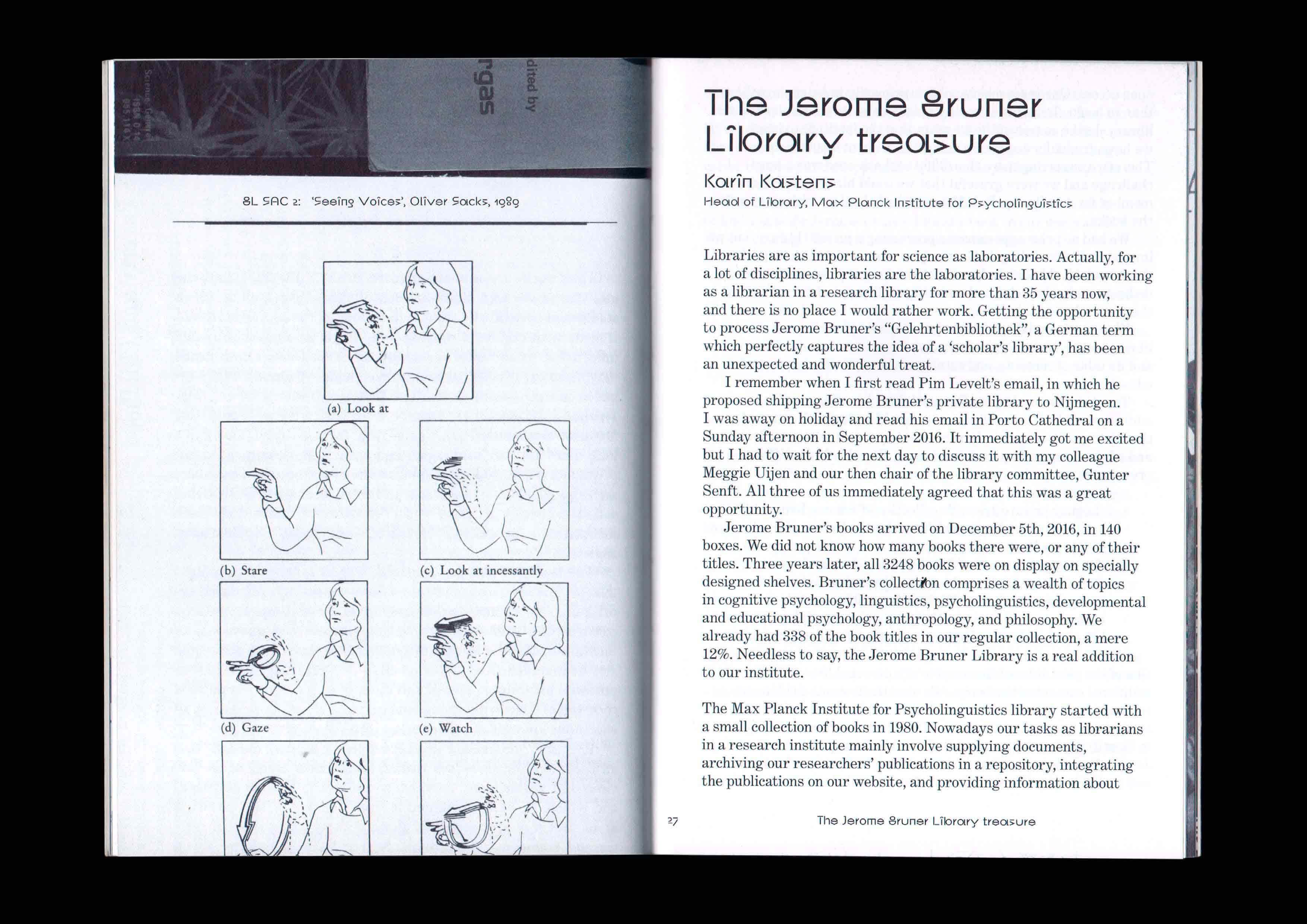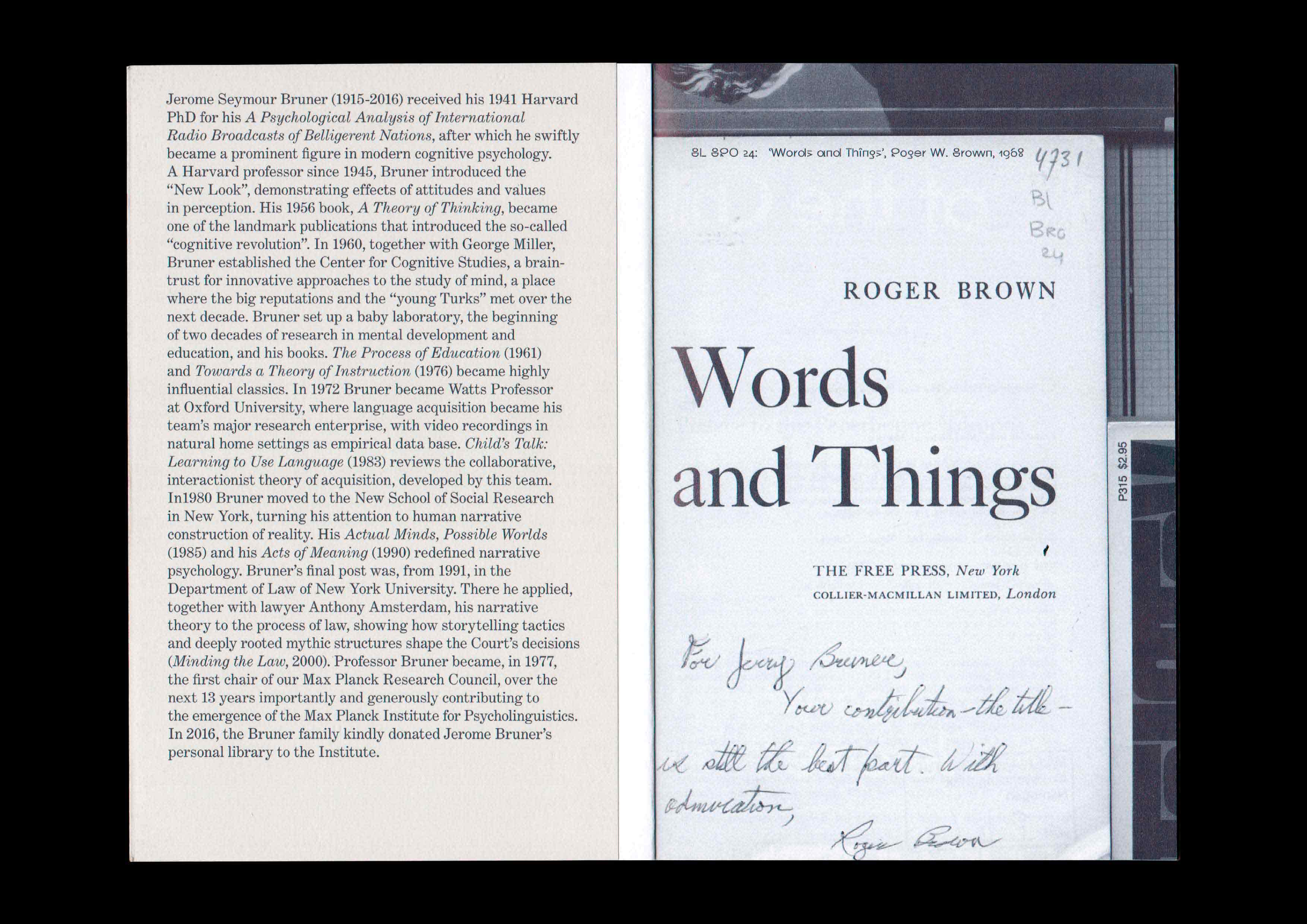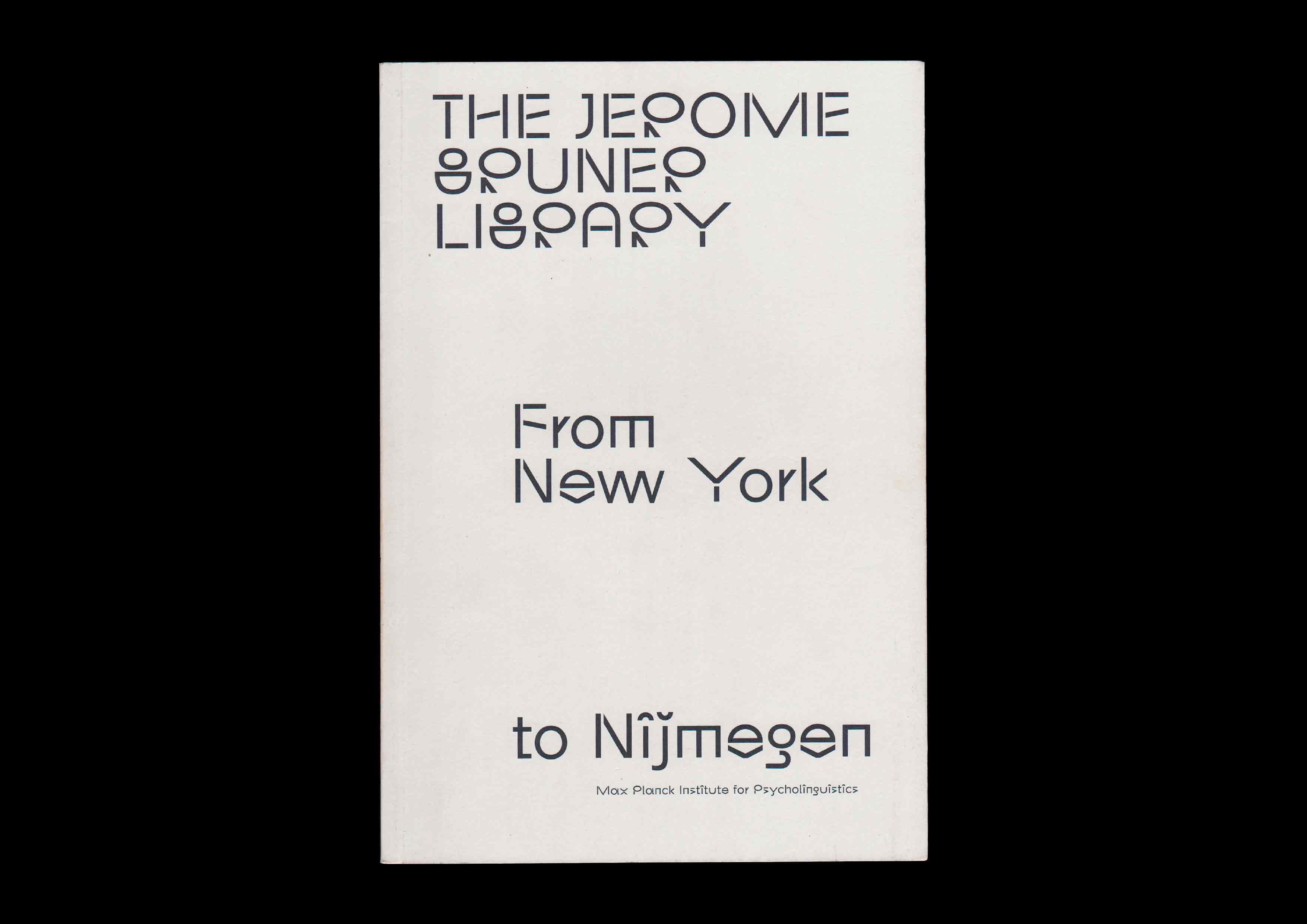 The Jerome Bruner Library: From New York to Nijmegen. Published by the Max Planck Institute for Psycholinguistics to commemorate the American psycholinguist Jerome Bruner, and to inaugurate the donation of his personal library to the institute. Texts by Willem J.M. Levelt, Karin Kastens and Eleanor M. Fox. Display typeface by Orange Slice Type. 2020