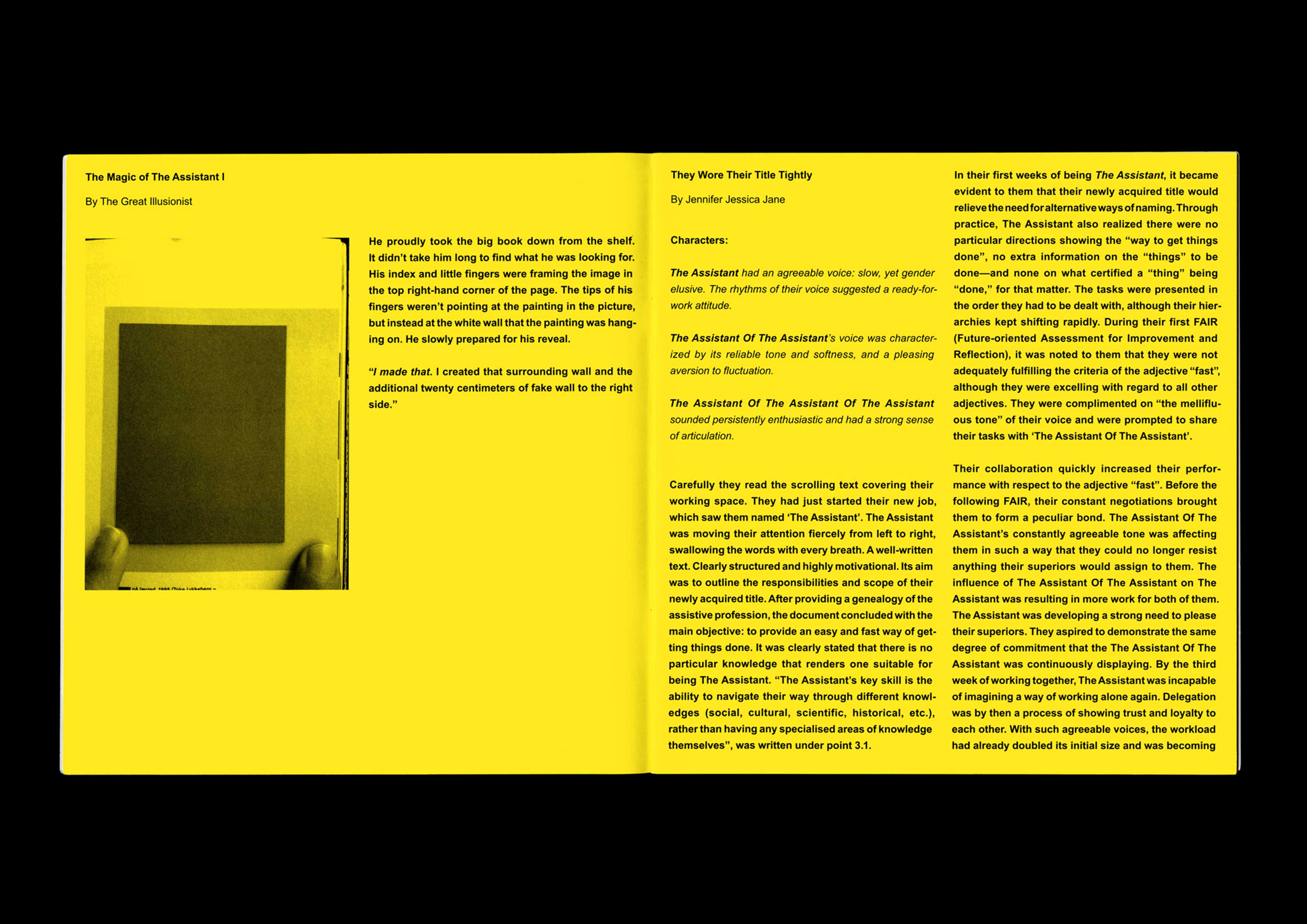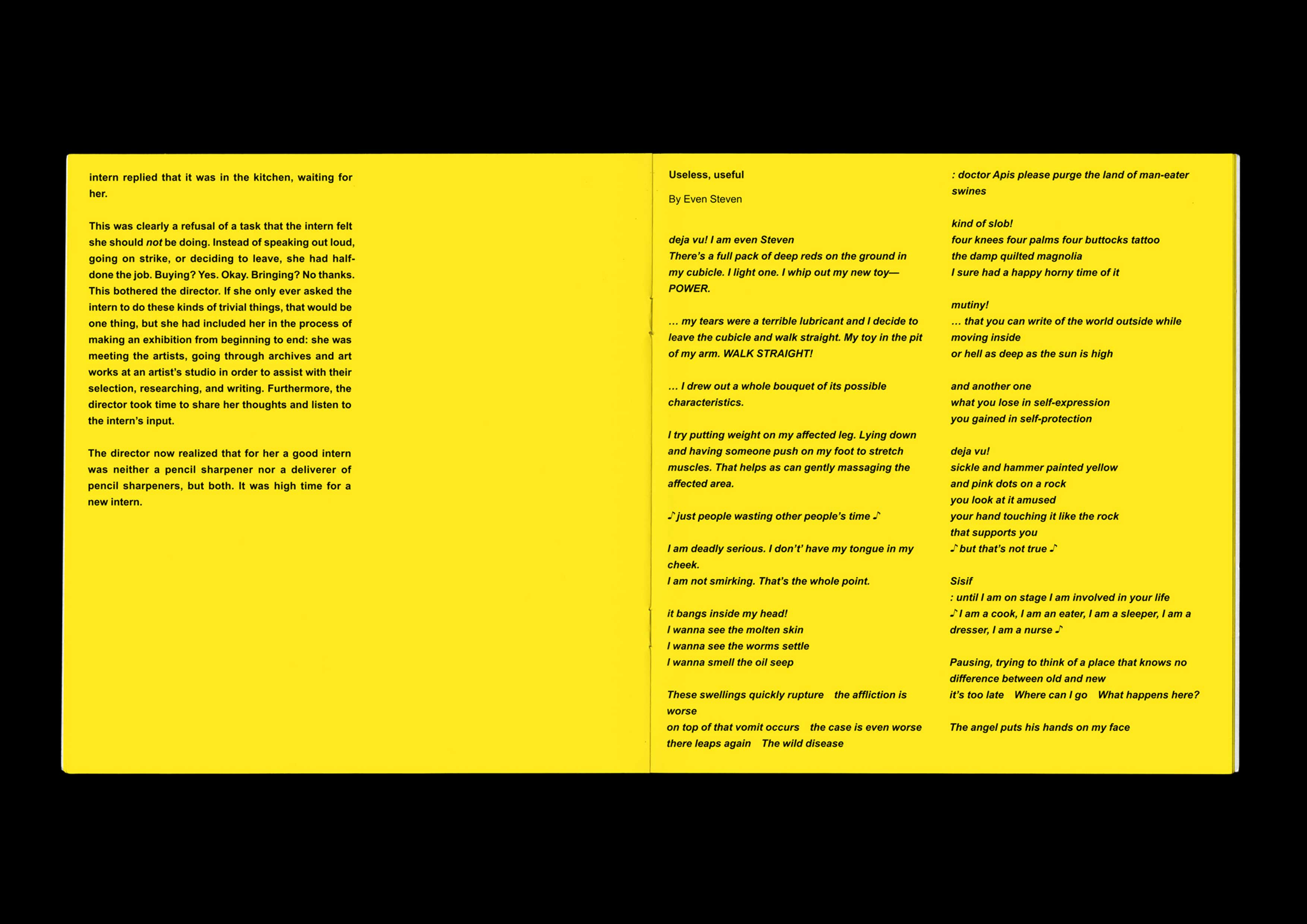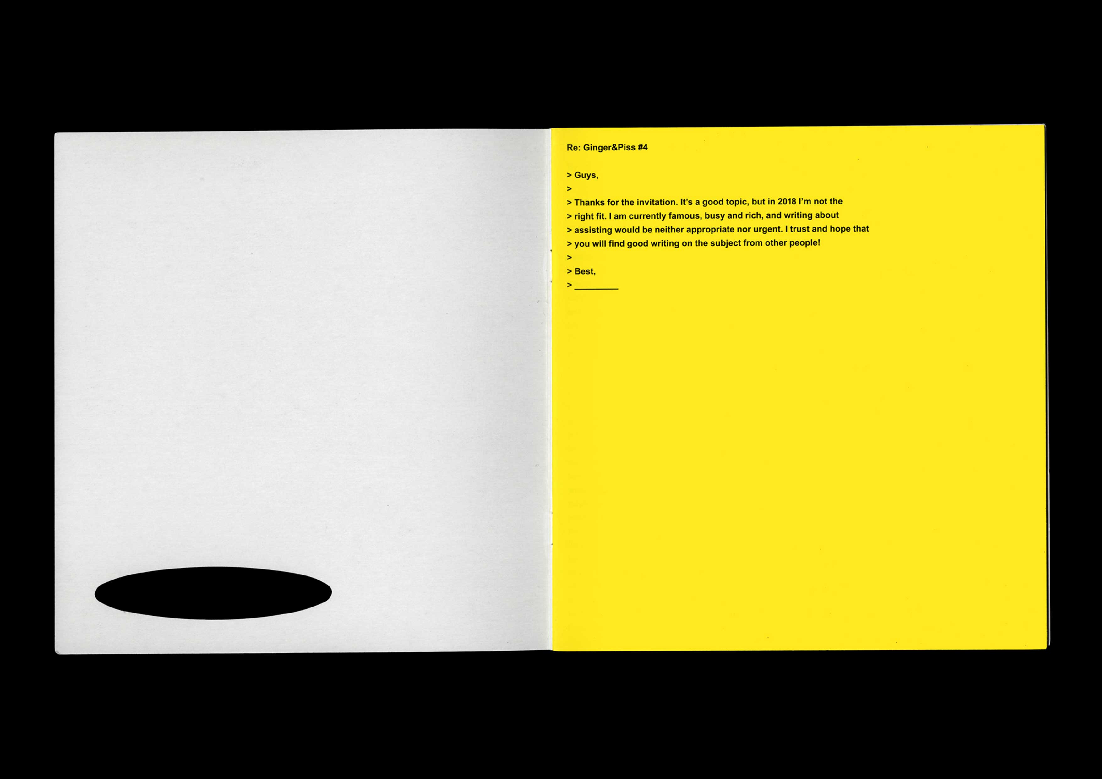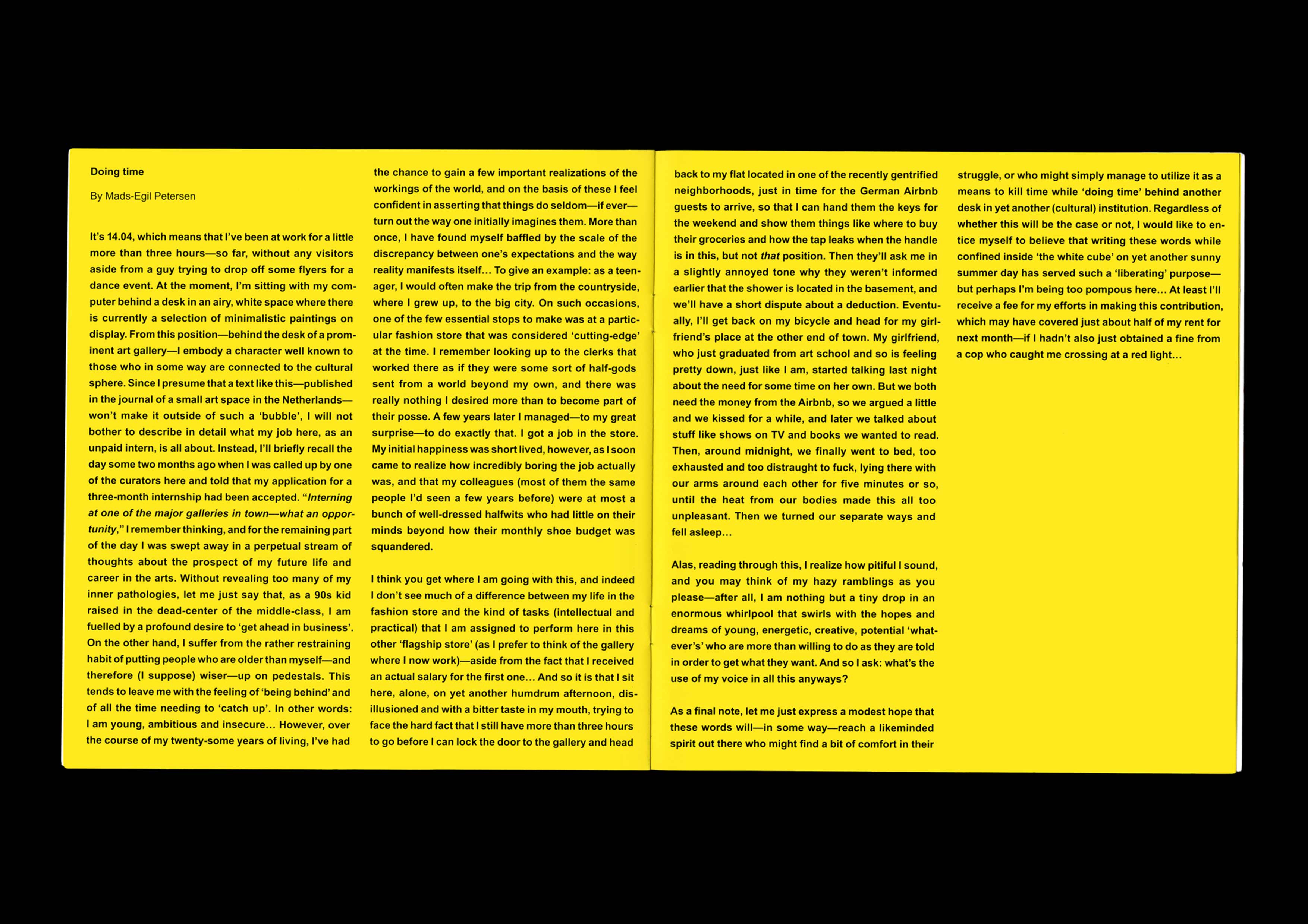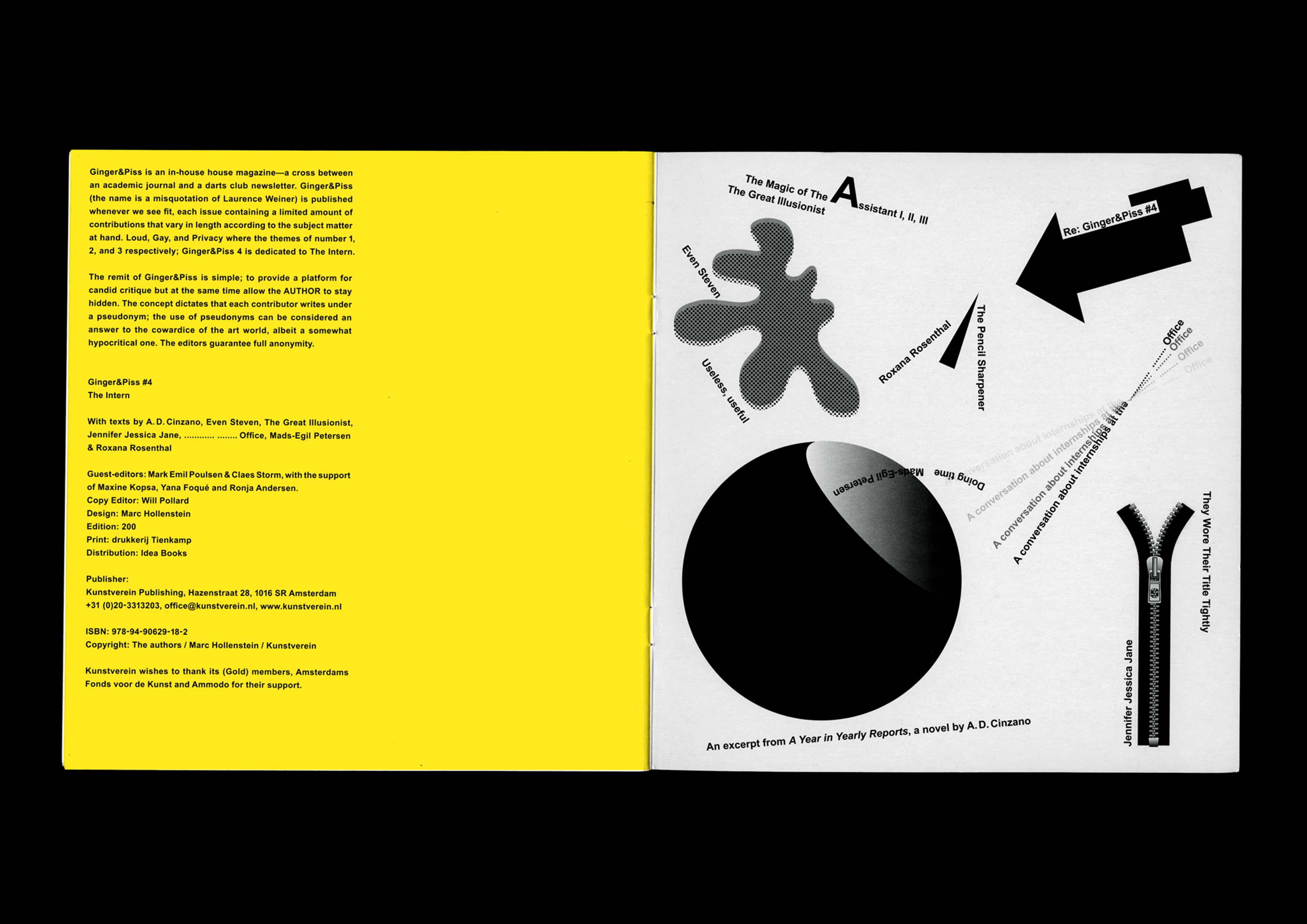 Ginger and Piss #4: The Intern. Guest-edited with Claes Storm, in conversation with Yana Foqué, Ronja Andersen and Maxine Kopsa. Designed by Marc Hollenstein. With contributions by A. D. Cinzano, Even Steven, The Great Illusionist, Jennifer Jessica Jane, ………… …….. Office, Mads-Egil Petersen and Roxana Rosenthal. Published by Kunstverein Publishing, Amsterdam. 2019